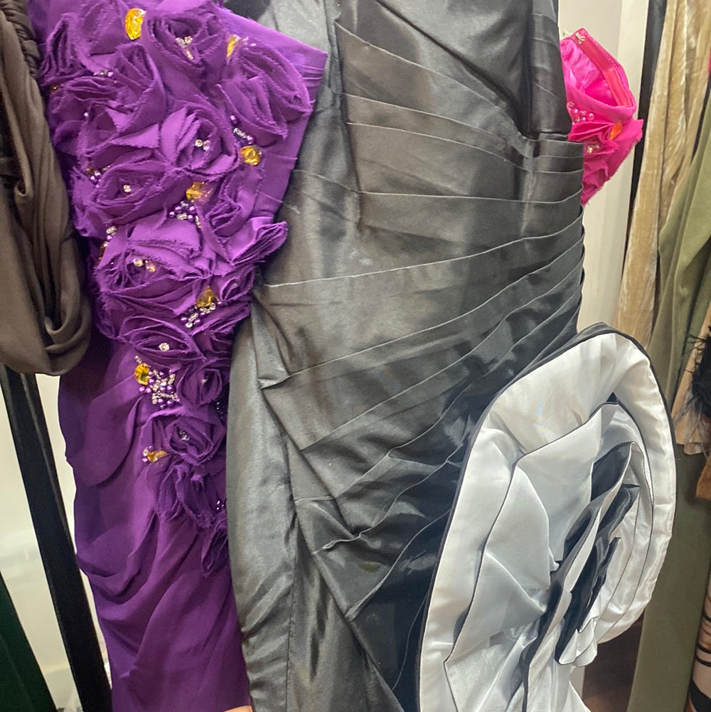 This Black and White Event Dress from Sassyn is perfect for any special occasion. The off-shoulder, strapless design features a high front and low back. The two-tone dress has a slit thigh and draped side, with a gathered hip for a flattering fit.
