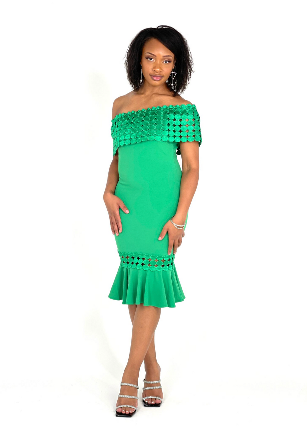 Elegant Kelly Off-Shoulder Green Designer Dress