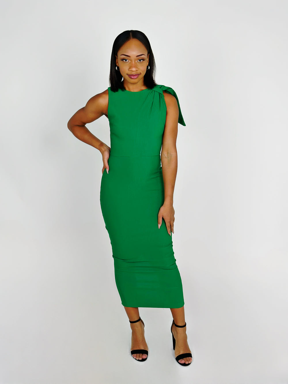 Introducing the Emerald Midaxi Dress. This stylish dress is perfect for any occasion. Featuring a sleeveless design with a ruched left shoulder, this dress is sure to turn heads. The midaxi length is perfect for showing off your favorite shoes.