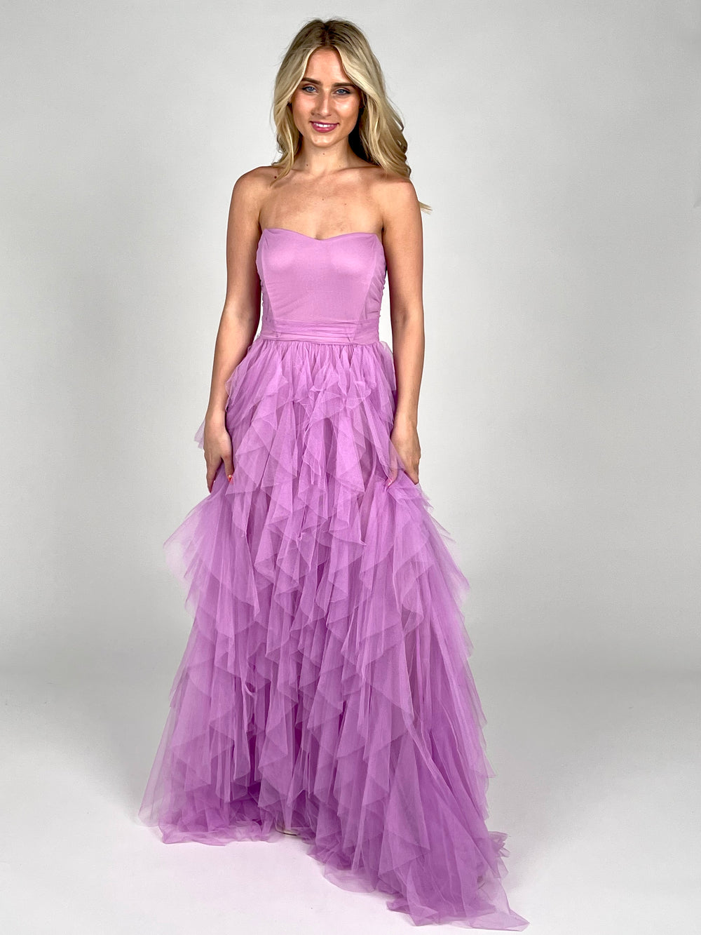 This dress is sure to turn heads and make you feel like a princess. Whether you're attending a wedding, prom, or any other special event, this dress will make you look and feel your best. Shop now and make a statement with this beautiful Lavender Tulle Dress.