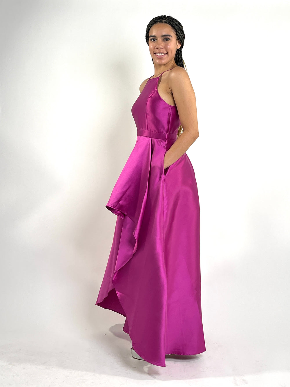 The magenta hue of this dress is perfect for any special occasion, from weddings to proms. The high low hemline adds a modern twist to the classic silhouette, making it a timeless piece that you can wear for years to come.