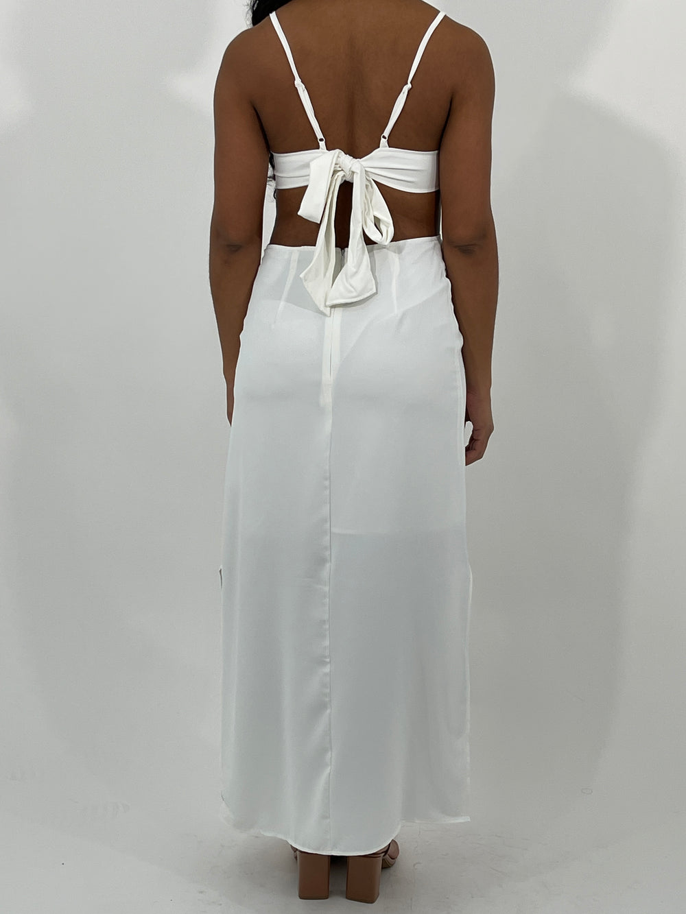 Experience the perfect fusion of comfort and style with our Off White Back Tie Sleeveless Strap Slit Long Dress. It's more than just a dress, it's a statement.