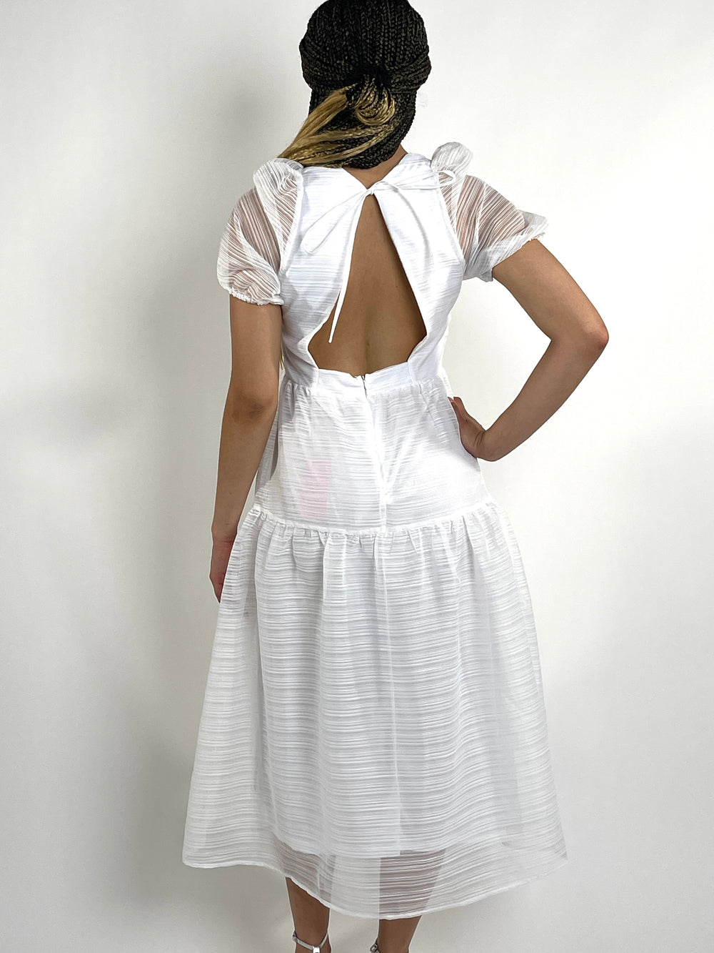 White Front Wrap Semi Sheer Short Sleeve Back Tie String Midi Dress