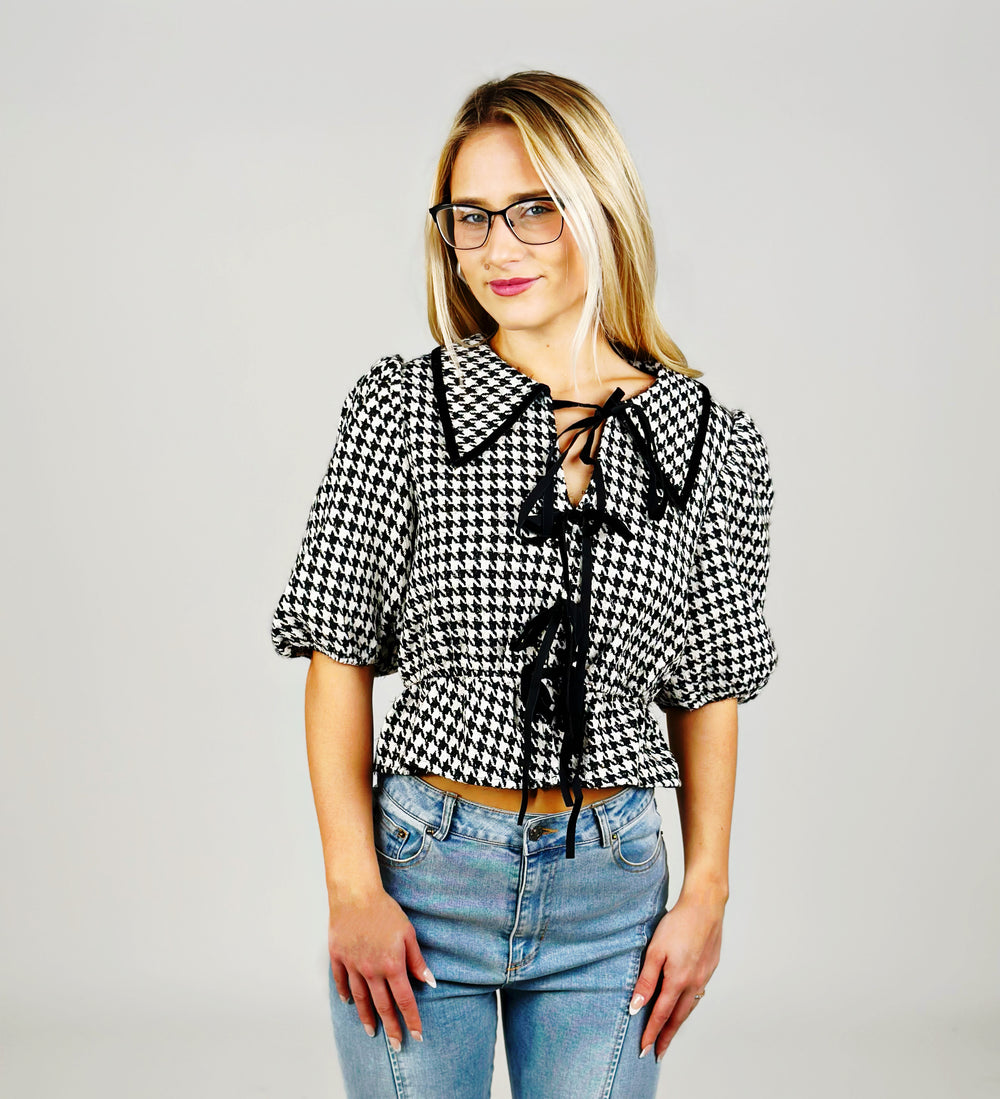 This Black Houndstooth Blouse is a stylish and versatile piece for any wardrobe. The printed tweed fabric is lightweight and comfortable, while the collar and short sleeves add a classic touch.