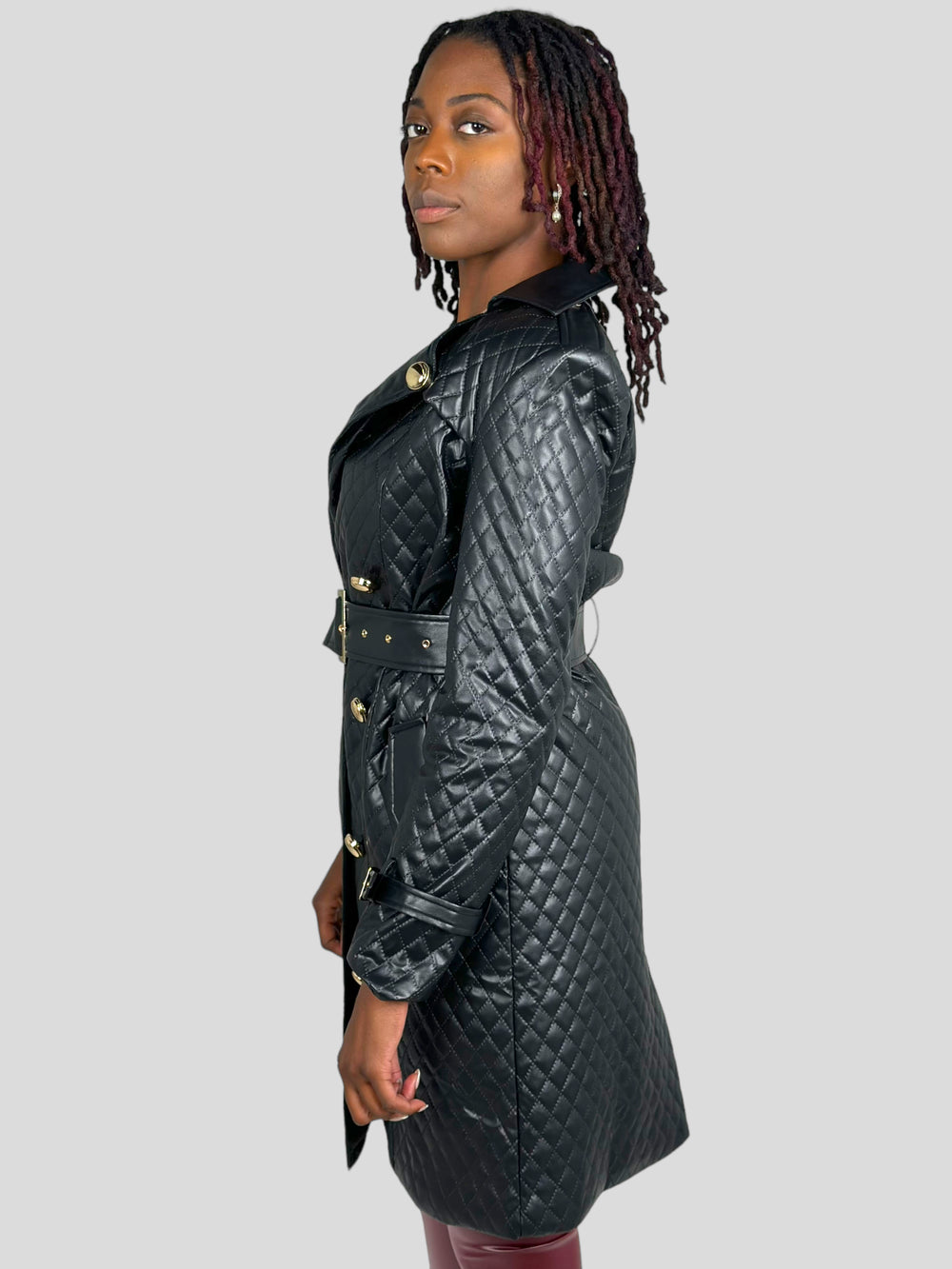 This Black Pu Coat is a stylish and reliable choice for any wardrobe. It features a quilted design with collars and a belt for a classic look. The fabric is made of 65% Polyester and 35% Pu for a comfortable and durable feel. The lining is 100% Polyester for added warmth and comfort.