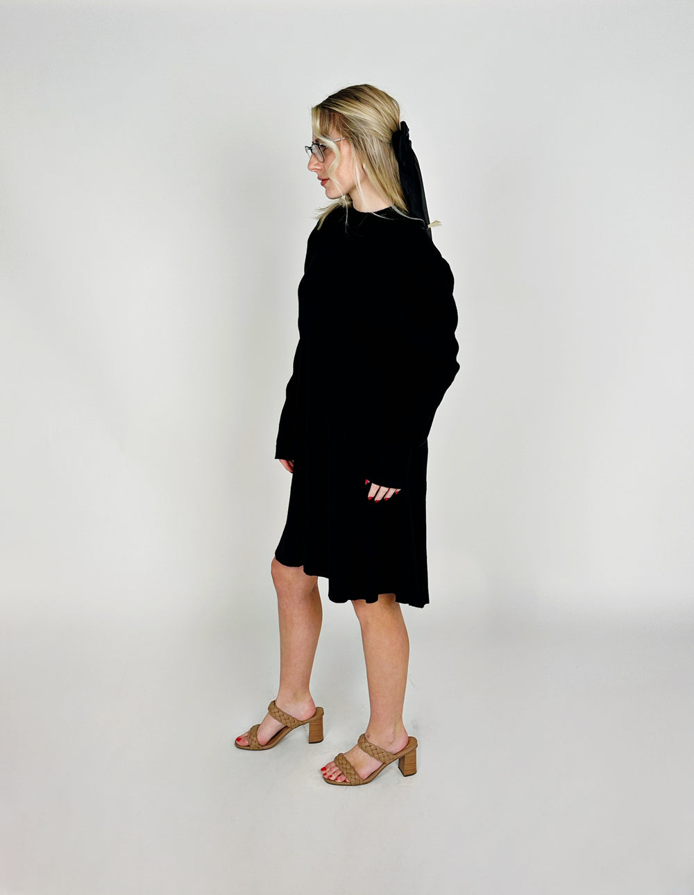This Black Mini Sweater Dress is the perfect addition to your wardrobe. It features a mock neck, puff shoulders, and long sleeves. The dress is made from a soft and comfortable fabric, making it perfect for any occasion.