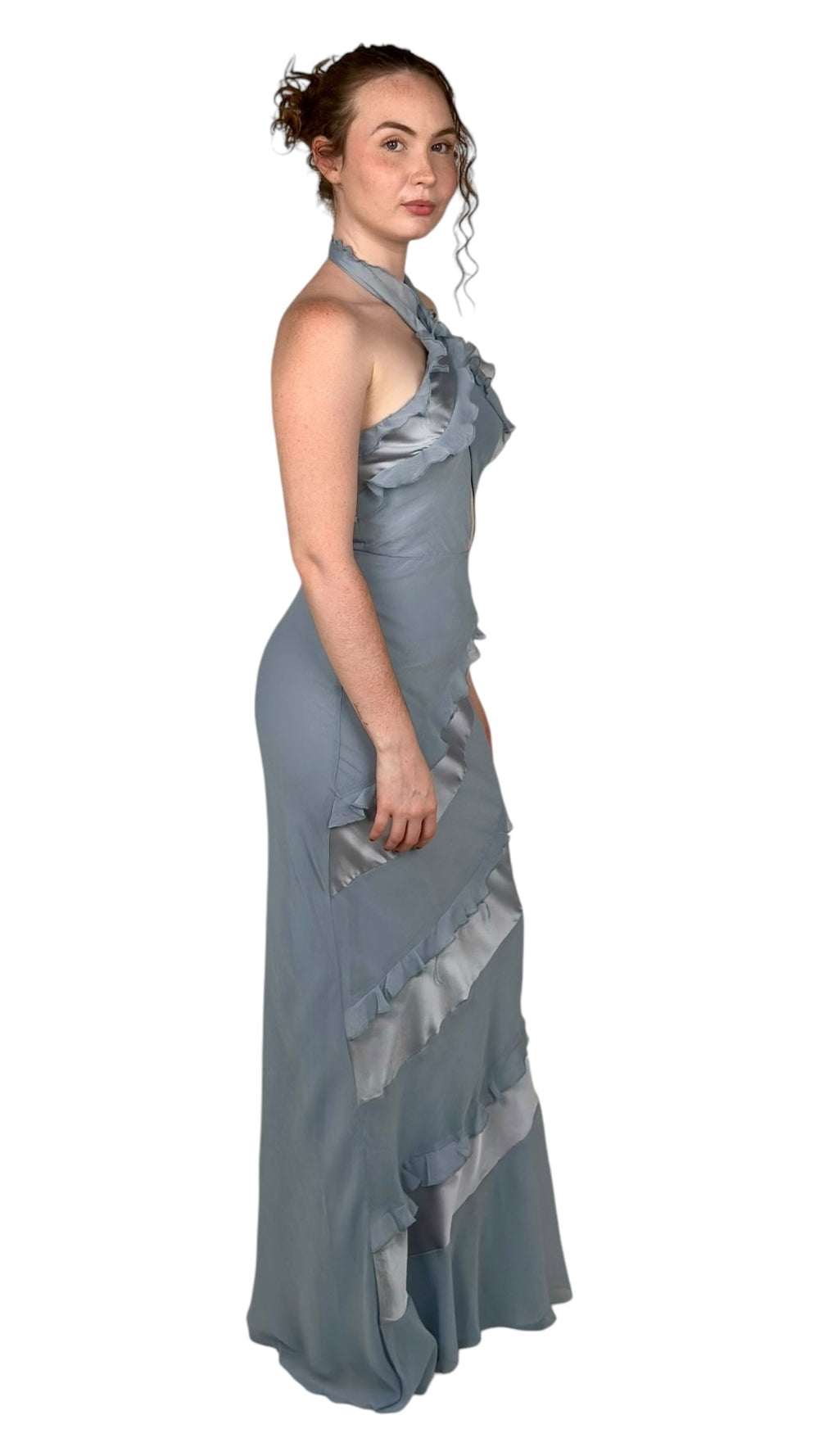 This stunning maxi dress is the perfect addition to your summer wardrobe. The halter neckline and cut-out design add a touch of elegance and sophistication, while the vibrant blue color and fringe detailing make it a fun and playful choice for any occasion.