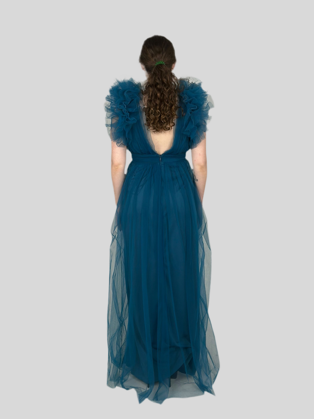 Introducing our stunning Blue Ruffle Sleeve Maxi Dress, the perfect addition to your wardrobe for any special occasion. This dress features delicate ruffle sleeves and a deep v-neckline, adding a touch of femininity and elegance. The slit sides and tulle fabric create a flowy and ethereal look, making you feel like a true goddess. The maxi length adds a touch of sophistication, while the vibrant blue color is sure to turn heads. Whether you're attending a wedding, prom, or any other formal event, this dress is sure to make you stand out. Don't miss out on this must-have piece, shop now at sassyn.shop.