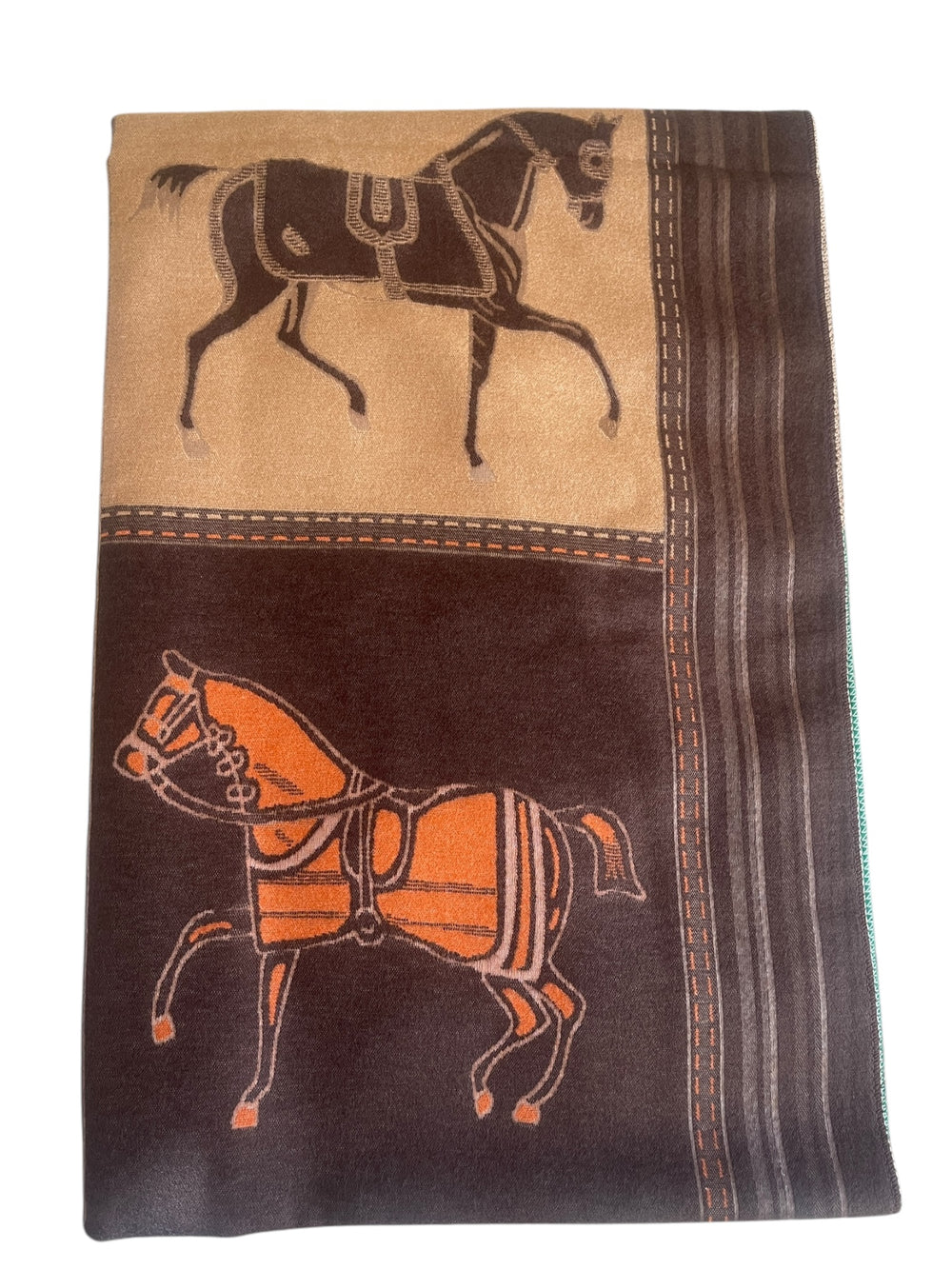 Add a touch of equestrian elegance to your wardrobe with this stunning reversible scarf. Measuring 74 by 28 inches, this scarf is the perfect size to drape over your shoulders or wrap around your neck for a cozy and stylish look. The warm brown, vibrant orange, and earthy green colors create a beautiful horse pattern that will make a statement with any outfit.