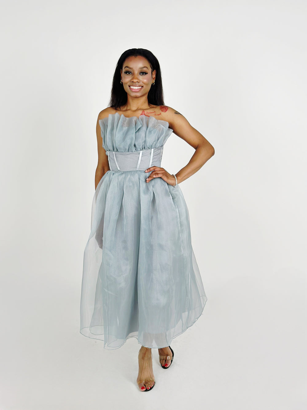 Introducing our latest must-have piece for your wardrobe - the Grey Strapless Organza Midi Dress. Made from luxurious organza fabric, this dress exudes elegance and sophistication. The soft grey hue adds a touch of femininity, while the lace-up detailing at the back adds a hint of playfulness.