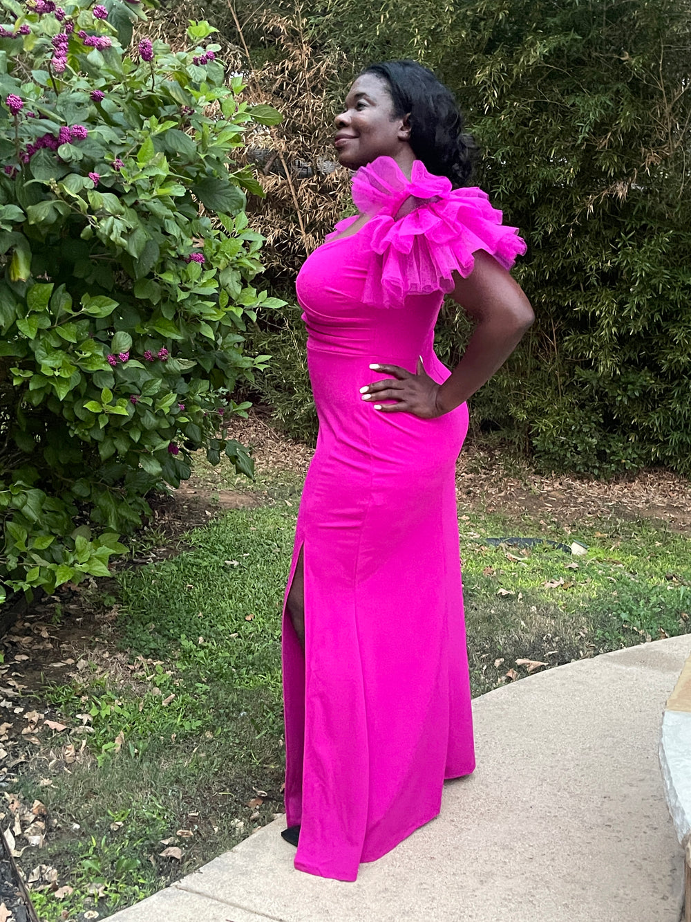 Make a statement in this stunning Hot Magenta Plus Size Maxi Dress from Sassyn. The dress features a mesh tulle shoulder design, adding a touch of elegance to the overall look. The surplice neckline and pleated detail create a flattering silhouette, while the slit on the left adds a touch of playfulness. The zipper back ensures a secure fit, while the moderate stretch allows for comfortable movement. Perfect for any occasion, this dress is a must-have for your wardrobe. Shop now at SassyN Shop and elevate your style game with this gorgeous maxi dress.