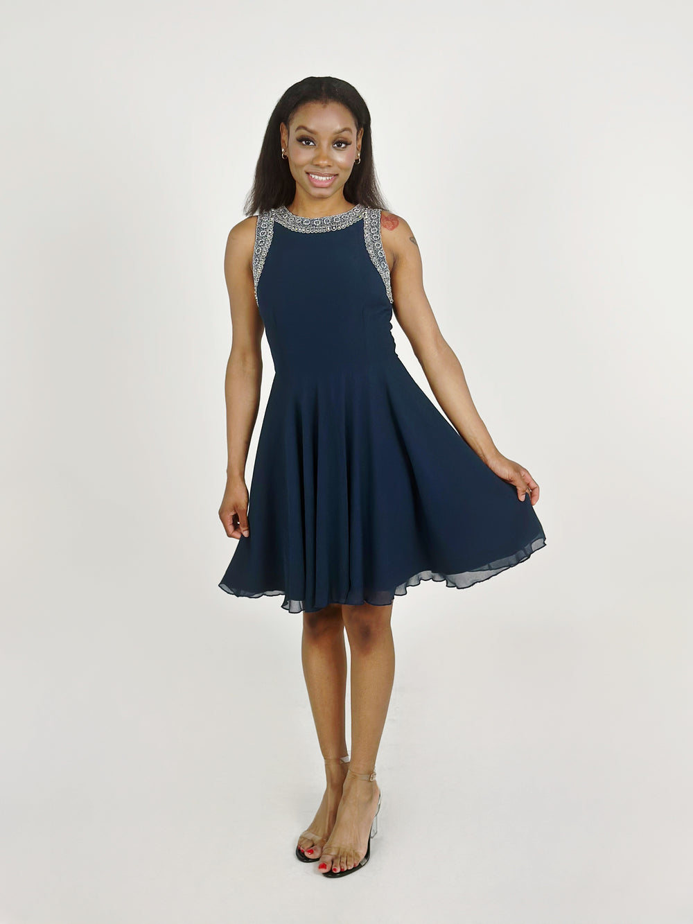 Get ready to turn heads in this stunning hand embellished skater dress. The navy color adds a touch of sophistication, while the A-line skirt creates a flattering silhouette. Perfect for any occasion, this dress is a must-have for your wardrobe.