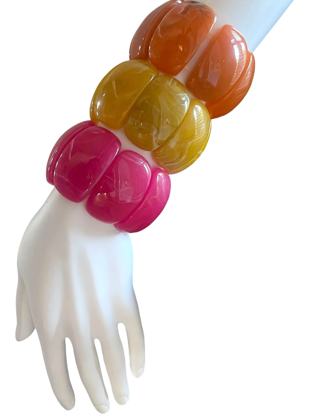 This classic resin cuff bracelet is a must-have for any fashion-forward woman. The bold orange color adds a pop of vibrancy to any outfit, making it the perfect statement piece. The wide geometric design is both eye-catching and versatile, making it suitable for any occasion.
