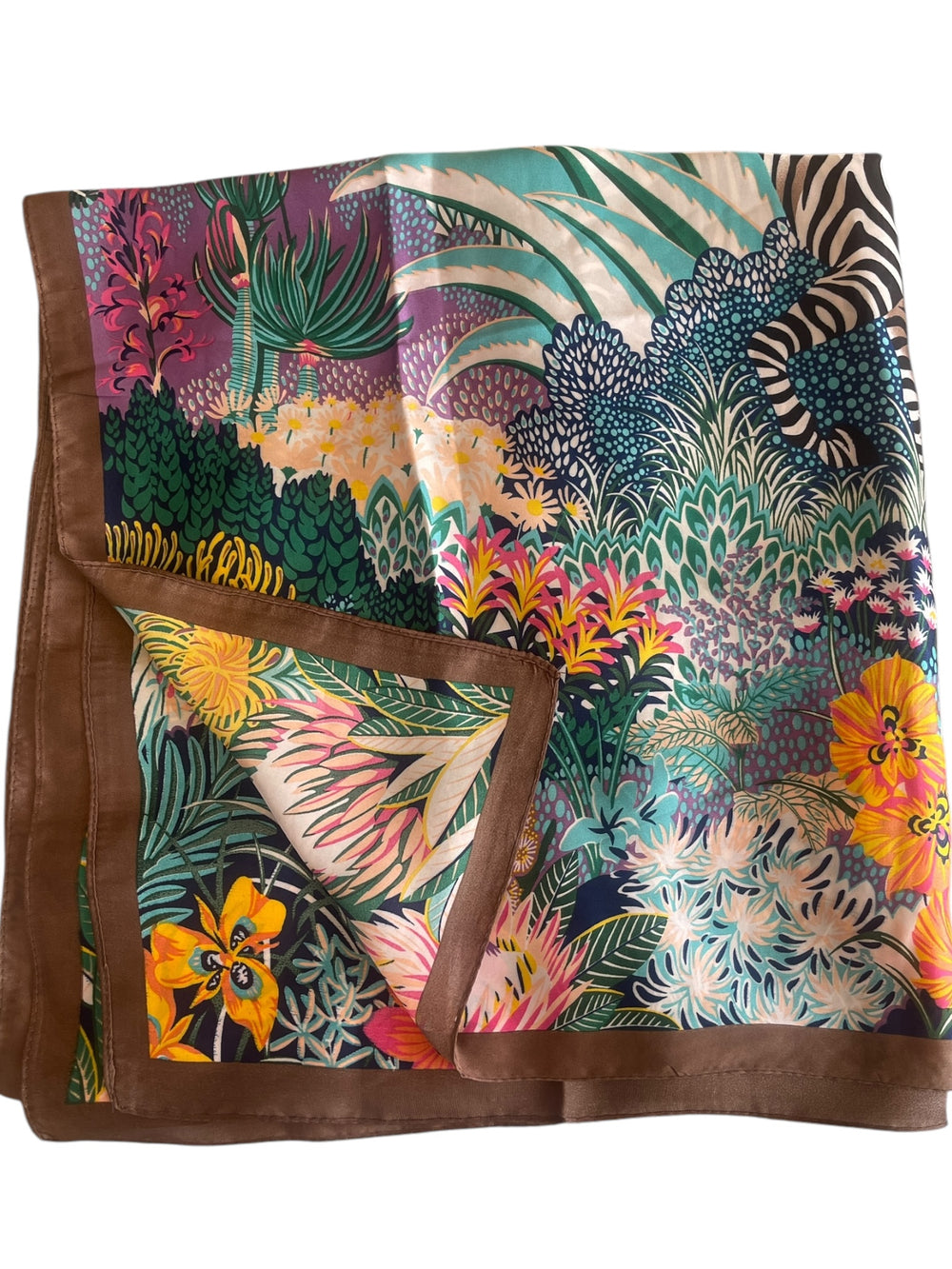 The scarf features a beautiful floral pattern in vibrant colors, adding a pop of color to any outfit. The intricate details and delicate design make it a versatile accessory that can be dressed up or down. Whether you're heading to a formal event or running errands, this scarf will elevate your look and keep you feeling fashionable.