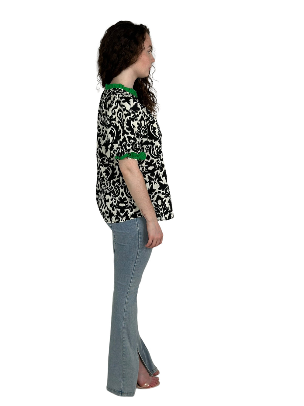 Elevate your wardrobe with our 'Print Ruffle Top'. This black and white blouse featuring vibrant green trims is a versatile piece. Effortlessly transitions from day to night, offering timeless sophistication with a modern twist. Pair it with tailored trousers for the office or jeans for a casual weekend look. Make a statement with understated elegance and playful accents. Shop now and elevate your style effortlessly.