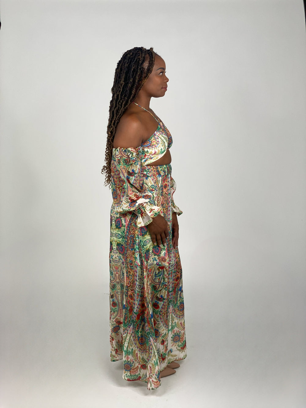 This Printed Long Sleeve Off Shoulder Dress is the perfect addition to your wardrobe. With a cut out design and drawstring neck, this dress is sure to turn heads. The hidden back zipper and smocked sleeves add a touch of sophistication, while the slit adds a hint of sass.