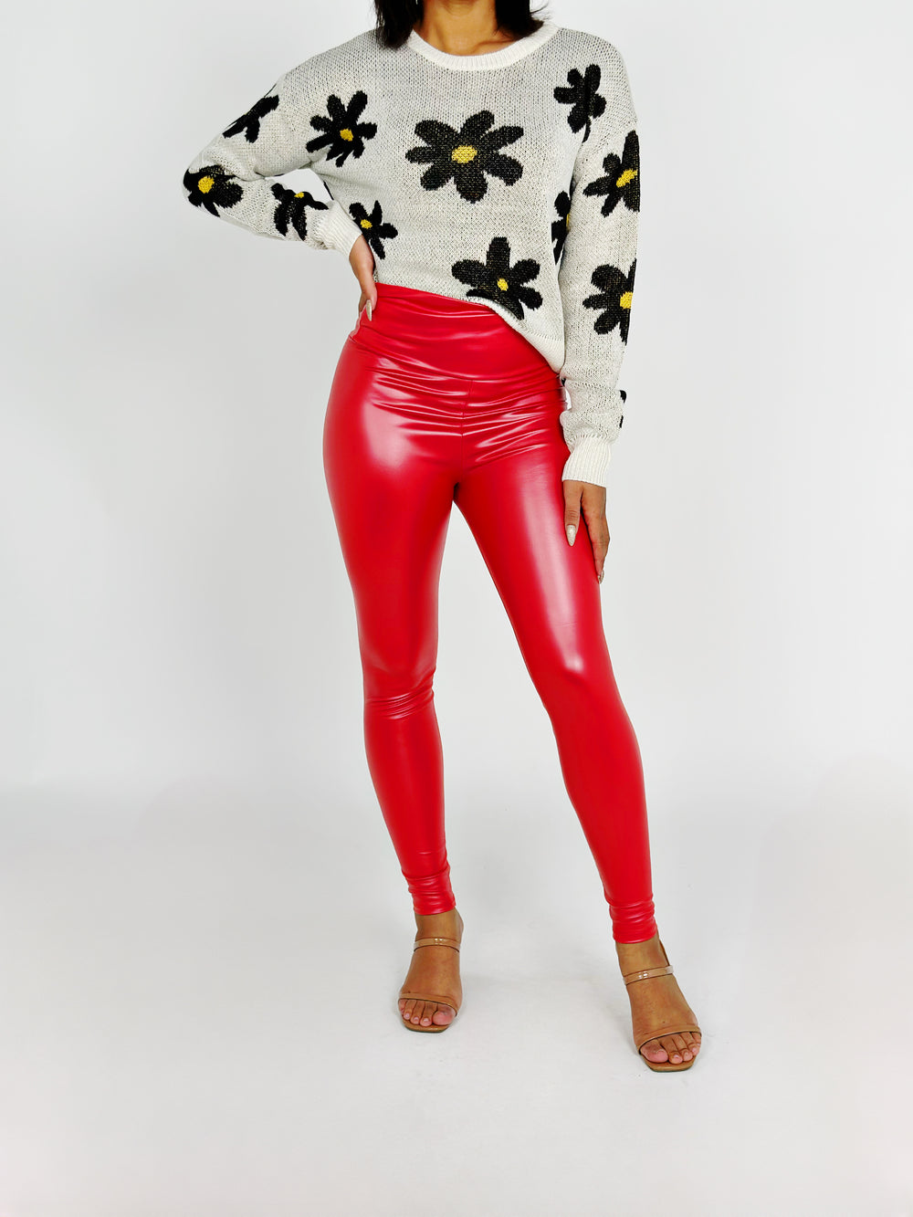 These Red faux Leather High Waist Leggings are perfect for any occasion. The leggings are made from a high-quality fabric that is sure to make you stand out. The waistband is designed to be comfortable and flattering, while the zipper detail adds a unique touch.