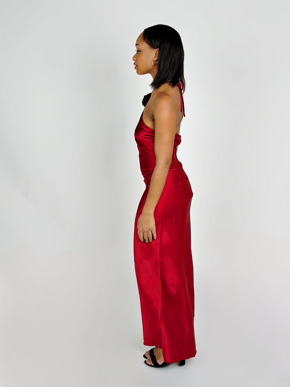 This Red Silk Flower Dress is a must-have for any wardrobe. The sleeveless design and back straps make it perfect for any occasion. The black front flower detail adds a touch of elegance to the long maxi dress.