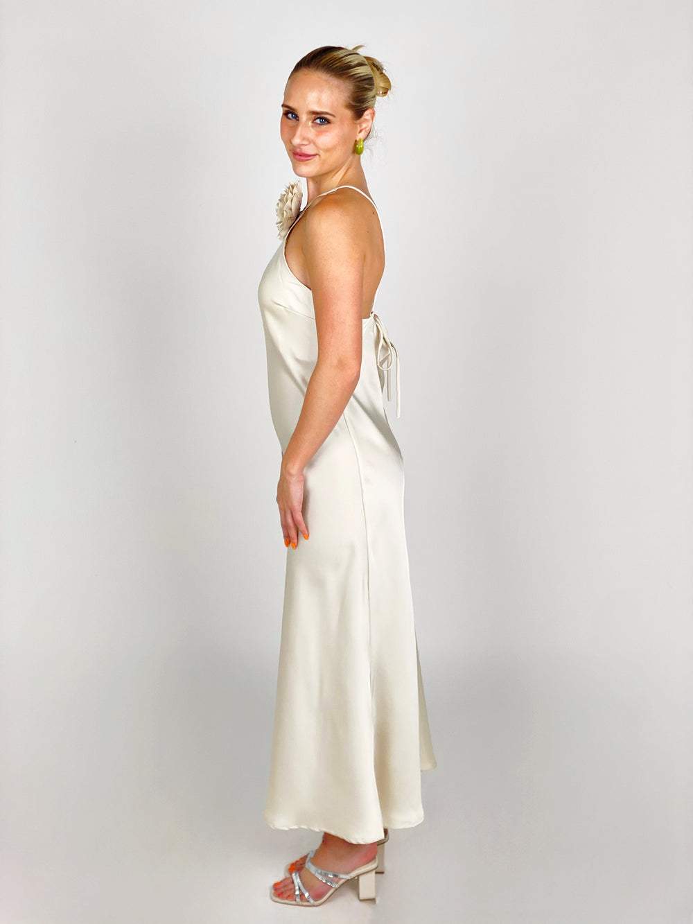 This Cream Silk Flower Dress is a must-have for any wardrobe. The sleeveless design and back straps make it perfect for any occasion. The cream front flower detail adds a touch of elegance to the long maxi dress.