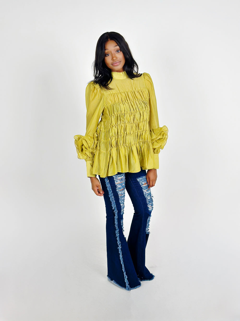 This Sycamore Long Sleeve Round Neck Top is a versatile addition to any wardrobe. With its solid color and classic round neck design, it can easily be dressed up or down for any occasion. The long sleeves provide coverage and warmth, while the flare ruffle on the sleeves adds a touch of femininity. The layered gathered hem adds dimension and movement to the top, making it a stylish choice for any outfit.