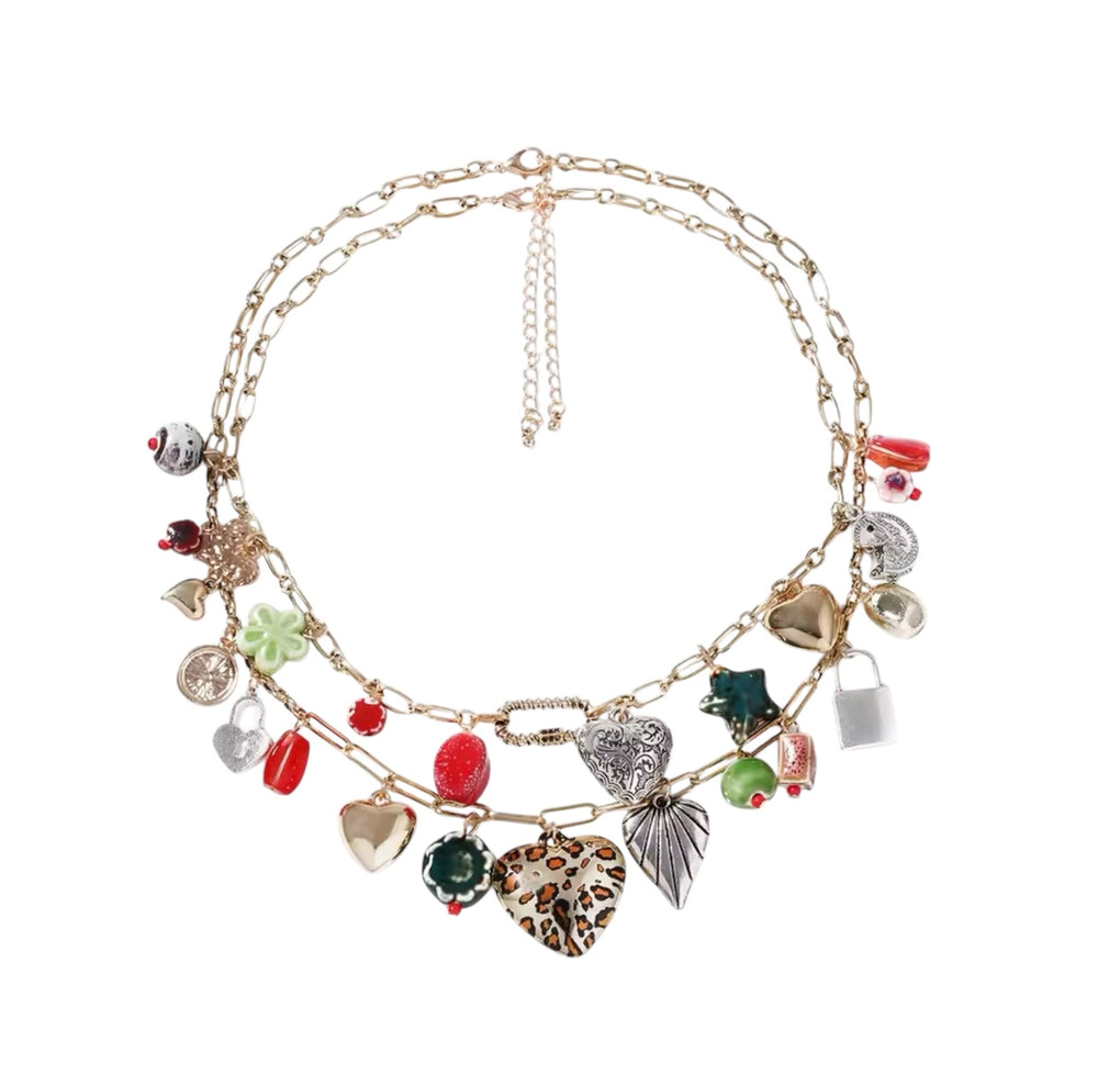 Introducing the Vintage Charm Necklace. This stunning piece features a heart-shaped pendant adorned with multiple charming trinkets, creating a unique and eye-catching design. Each charm has been carefully selected to add a touch of nostalgia and elegance to this necklace.