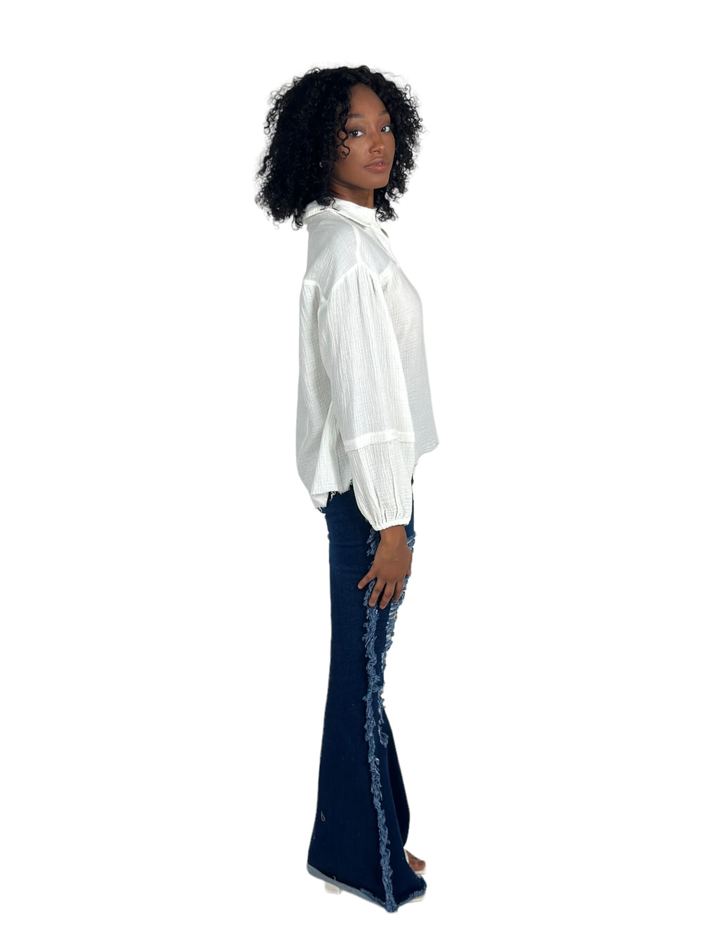 Don't miss out on this innovative piece that combines comfort, style, and versatility. Shop the White Collared Gauze Top now at SassyN and elevate your wardrobe to the next level.