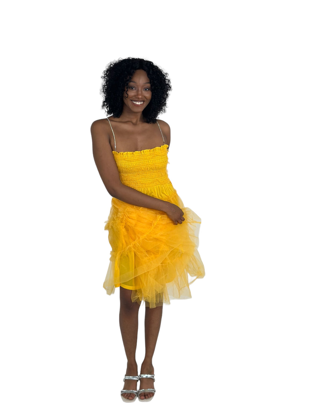 Get ready to turn heads in this stunning mini dress from our latest collection. The bright yellow hue is perfect for adding a pop of color to your wardrobe, while the sleeveless design is perfect for warmer days. The bejeweled spaghetti straps add a touch of glamour, making this dress perfect for any special occasion.
