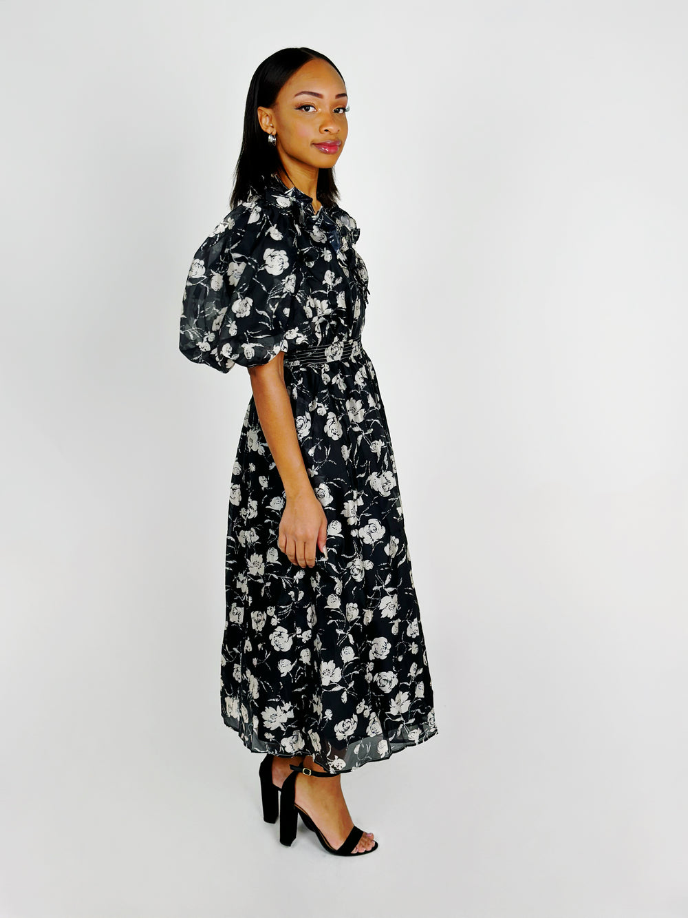 This Black Wrap Midi Dress is a stylish and sophisticated choice for any occasion. The deep V-neck and ruffle collar add a touch of femininity, while the white flower print adds a touch of elegance. The dress is finished with a belted waist for a flattering fit.