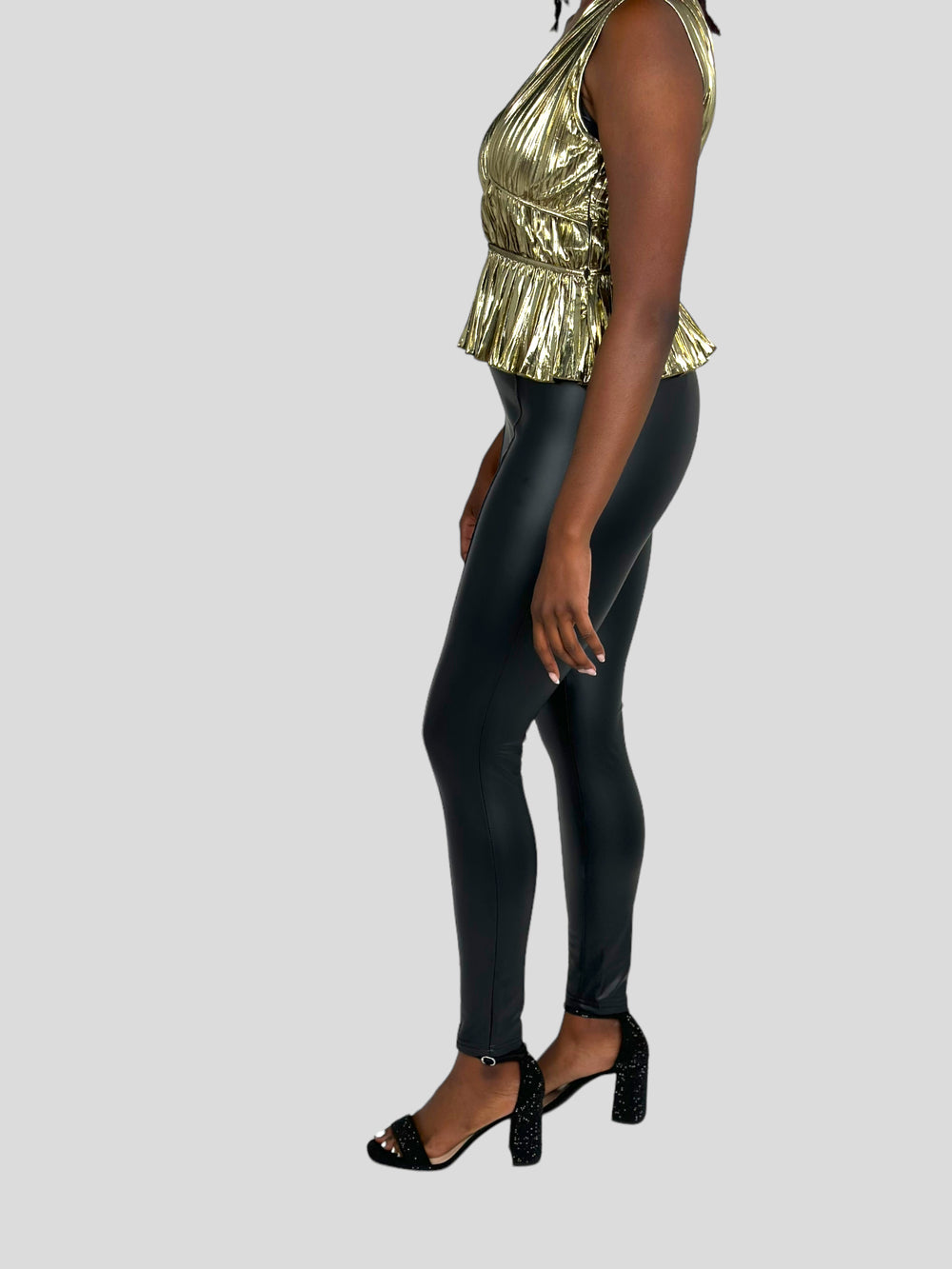This Gold Lurex Sleeveless Top is the perfect addition to your wardrobe. It features a deep v neckline and pleated detailing for a stylish and sophisticated look. The gold lurex fabric adds a touch of glamour and sparkle to any outfit.