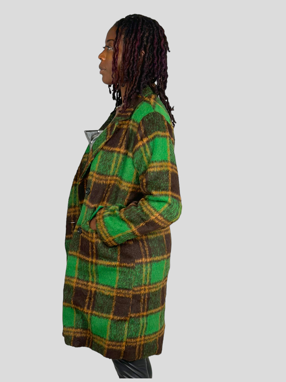 This Green Plaid Coat is a stylish and timeless piece. It is made from a mohair-like fabric, giving it a luxurious feel. It features notched lapels, long sleeves, and a double breasted bodice. This coat is perfect for any occasion, from a casual outing to a formal event.