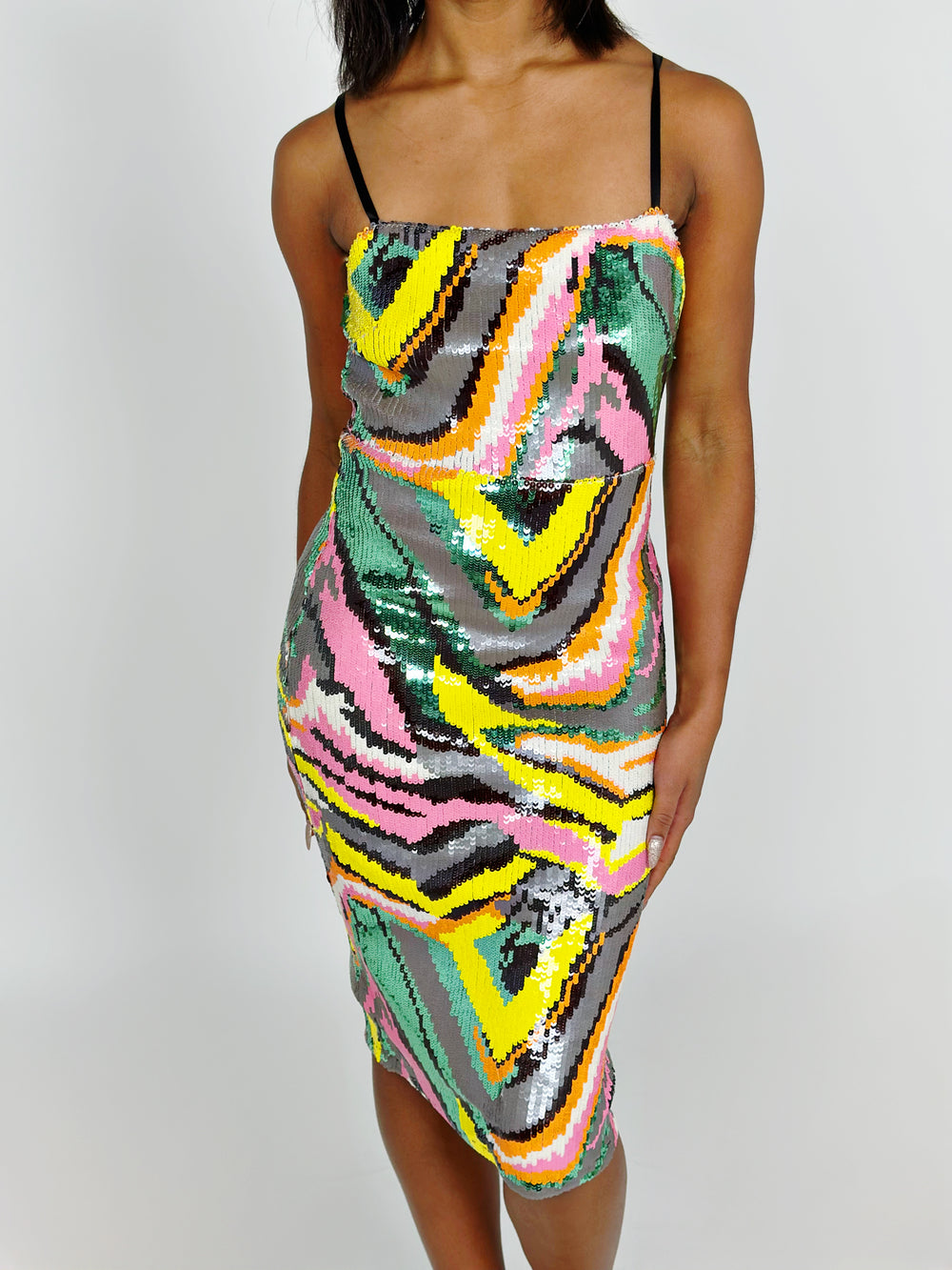 The Larissa Sequin Sheath Dress is a showstopper. This multi-color sequin dress is sure to turn heads. The hidden zipper and adjustable straps make it easy to customize the fit. The sequin overlay adds a touch of glamour to any occasion.