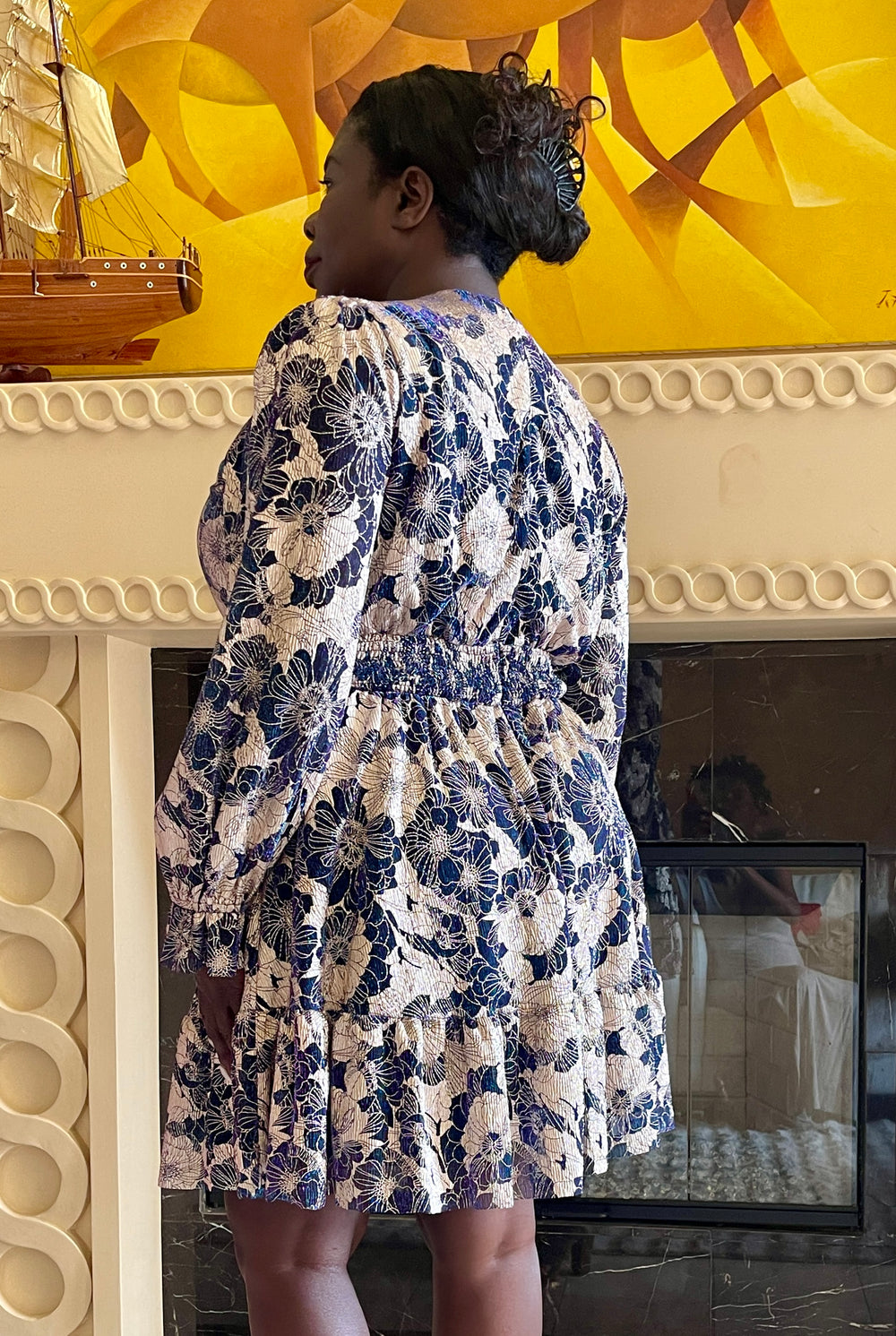 This Navy/Gold Floral Mini Dress is perfect for any occasion. The dress features a glittery navy and gold floral pattern, a front twist, and ruffles. It is sure to make you stand out in any crowd.
