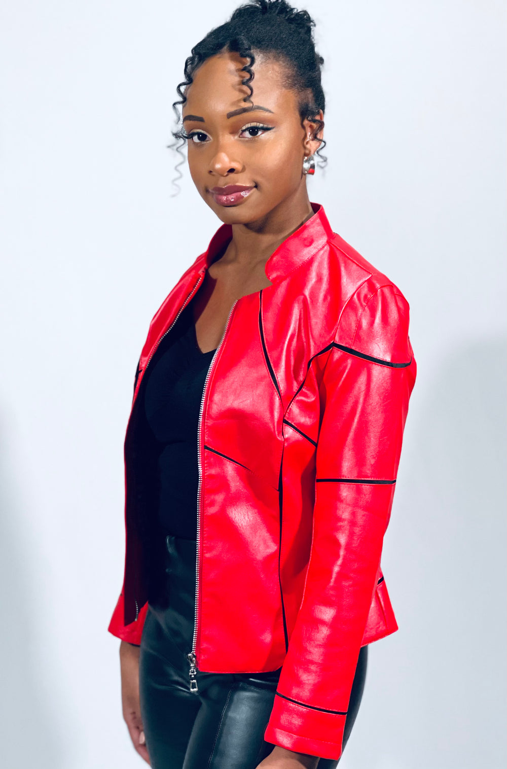 Red Mock Neck Long Sleeve Front Zipper Biker Crop Jacket