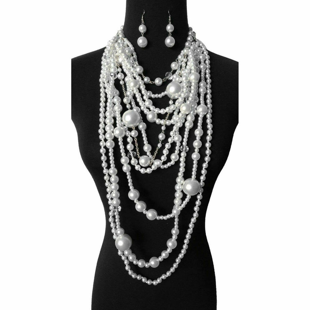 - Pearl Layered Chunky Statement Necklace - Multi Layered 1920 Gatsby Style Pearl Necklace - Size: Earrings: 2 inch Long - Weight: 0.8 Lb. - Theme: Pearl, Bib, Statement, Waterfall, Multi-Layer - Stone: Faux Pearl - Clasp: Lobster Claw with Extension Chain - Lead & Nickel Compliance or Free.