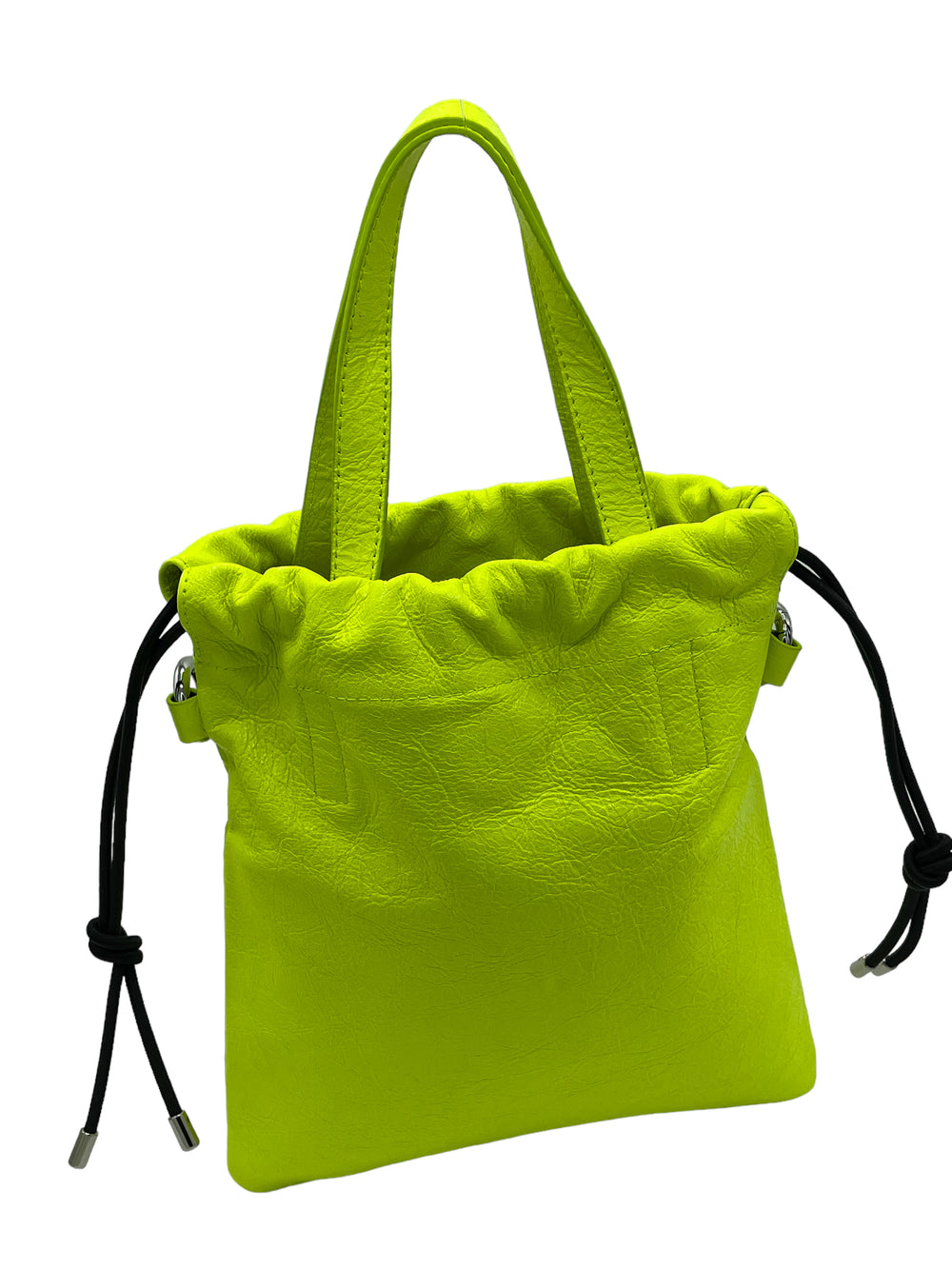 This stylish Lime Green Leather Purse is the perfect accessory for any outfit. Crafted from genuine leather, it features short leather handles, a 43in shoulder strap and an 18in metal chain handle for easy carrying. It measures 8.5in wide, 9.5in high and 2in wide. The black elastic draw string and magnetic close make it easy to open and close, while the bright lime green color adds a pop of color to any look.