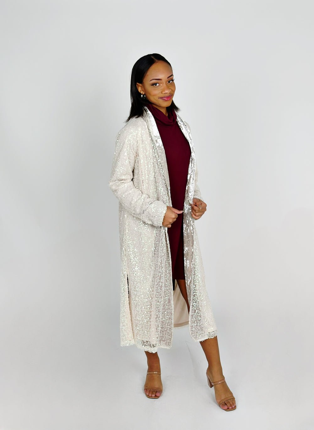 This Champagne Velvet Sequin Jacket is a must-have for any wardrobe. The luxurious velvet collar and sequin detailing make this jacket a statement piece. Perfect for a night out or a special occasion, this jacket will make you stand out from the crowd.