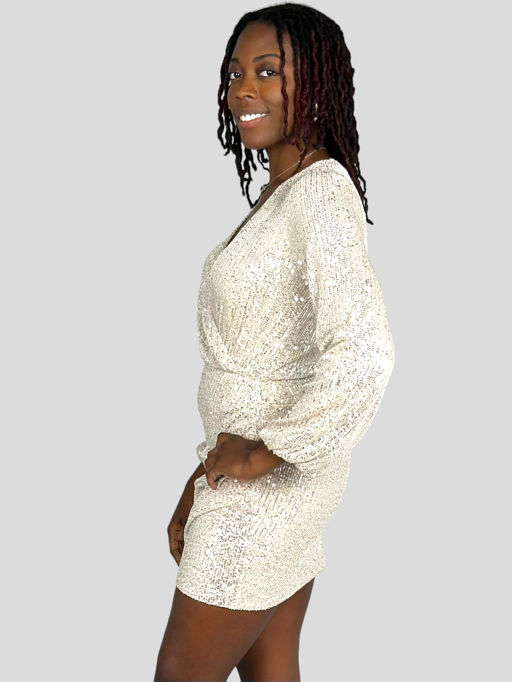 This beige sequin mini dress is the perfect way to make a statement. The long sleeves which are wide at the cuffs add a touch of sophistication, while the deep V neckline adds a hint of glamour. The sequins sparkle and shine, making this dress a must-have for any special occasion.