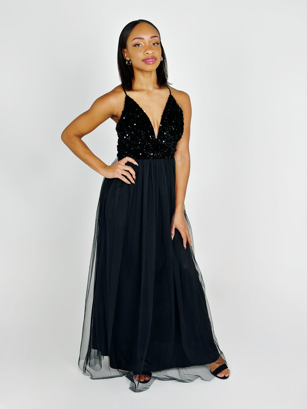 This Black Mesh Maxi Dress is the perfect combination of style and comfort. The sequined cami top features sleeveless straps for a flattering fit. The maxi mesh skirt adds a touch of elegance to the look.