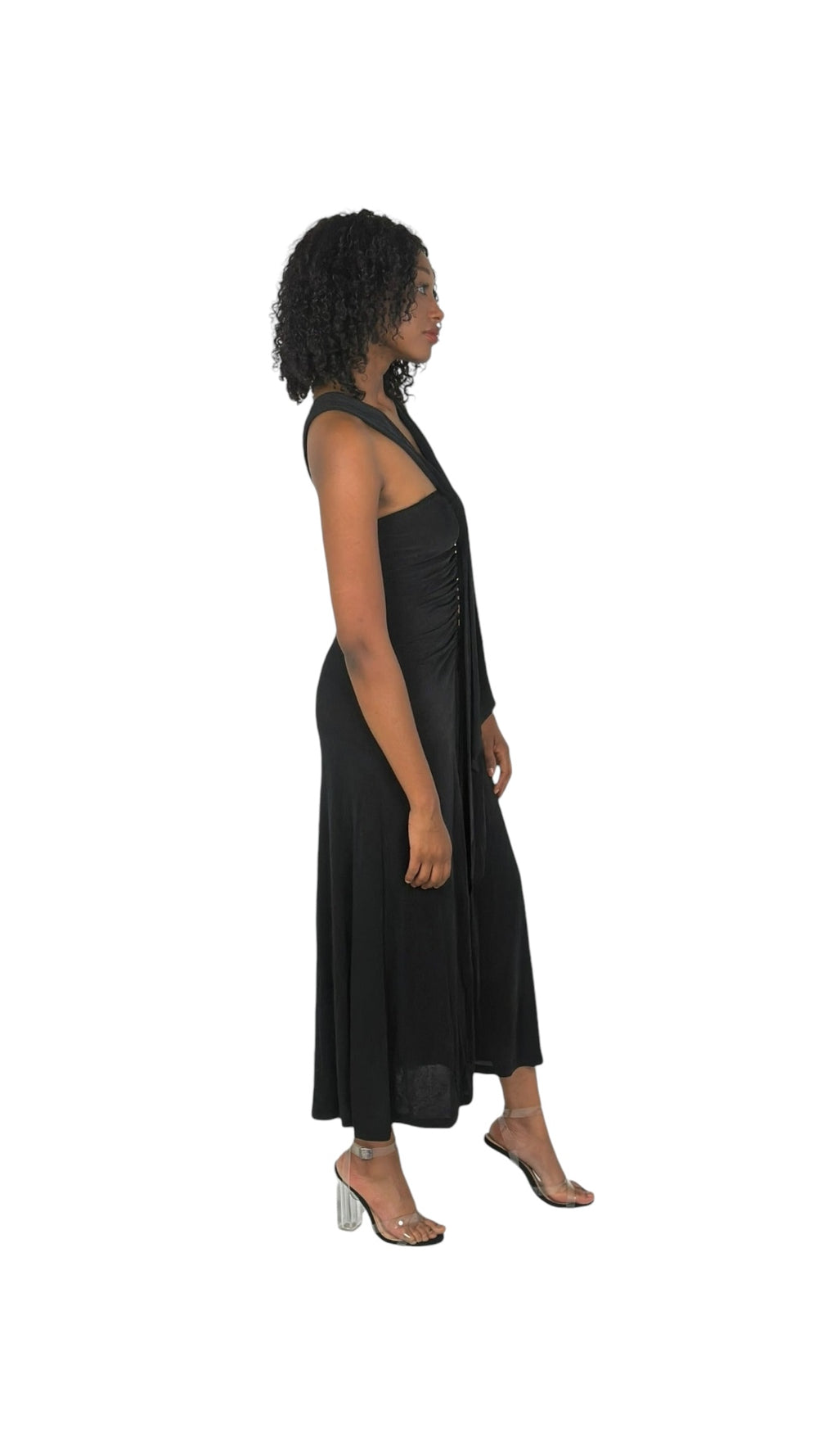 The dress features a solid color, making it easy to style and accessorize. The high slit adds a touch of drama and allows for easy movement. The fit is flattering and comfortable, making it suitable for all body types.