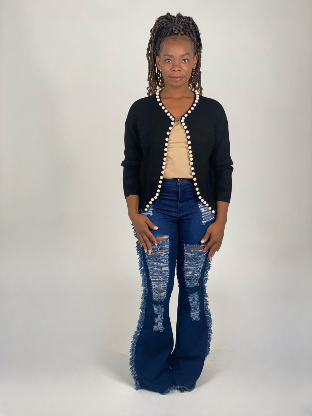 This Black Pearl Trim Sweater from Sassyn Shop is the perfect addition to your wardrobe. The long sleeves and pearl trim cardigan will keep you warm and stylish all season long. The sweater is made from a soft and comfortable fabric, making it perfect for any occasion.