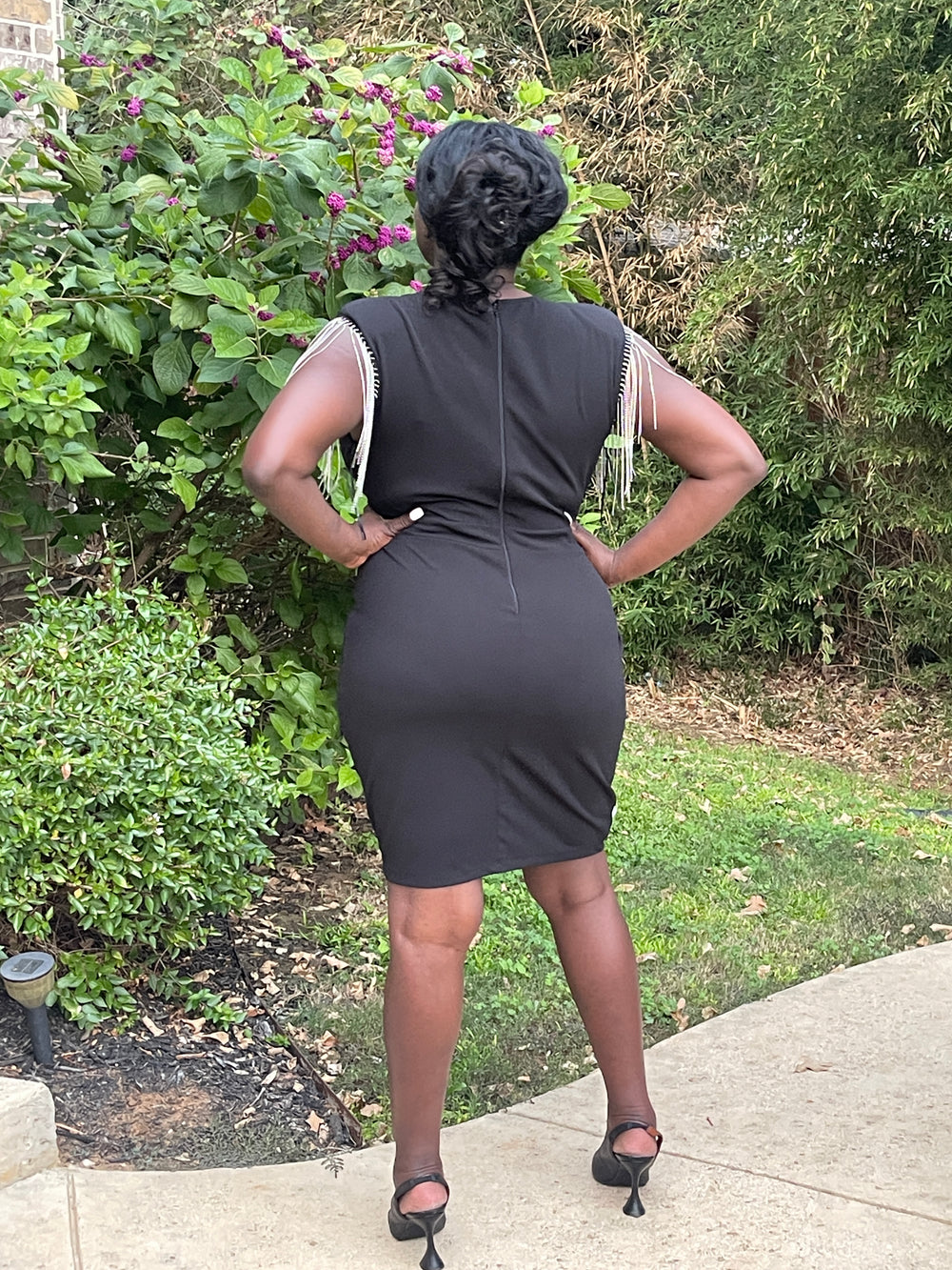 Get ready to turn heads in this stunning and innovative dress. The Crystal Metal Chain Fringe Sleeve adds a touch of glamour and edge to this classic black dress. The Surplice V-Neck and Open Back design will accentuate your curves and make you feel confident and sexy. With a zipper back skirt and attached shoulder pads, this dress is both stylish and comfortable. And with moderate stretch, it will hug your curves in all the right places. Don't miss out on this must-have addition to your wardrobe.
