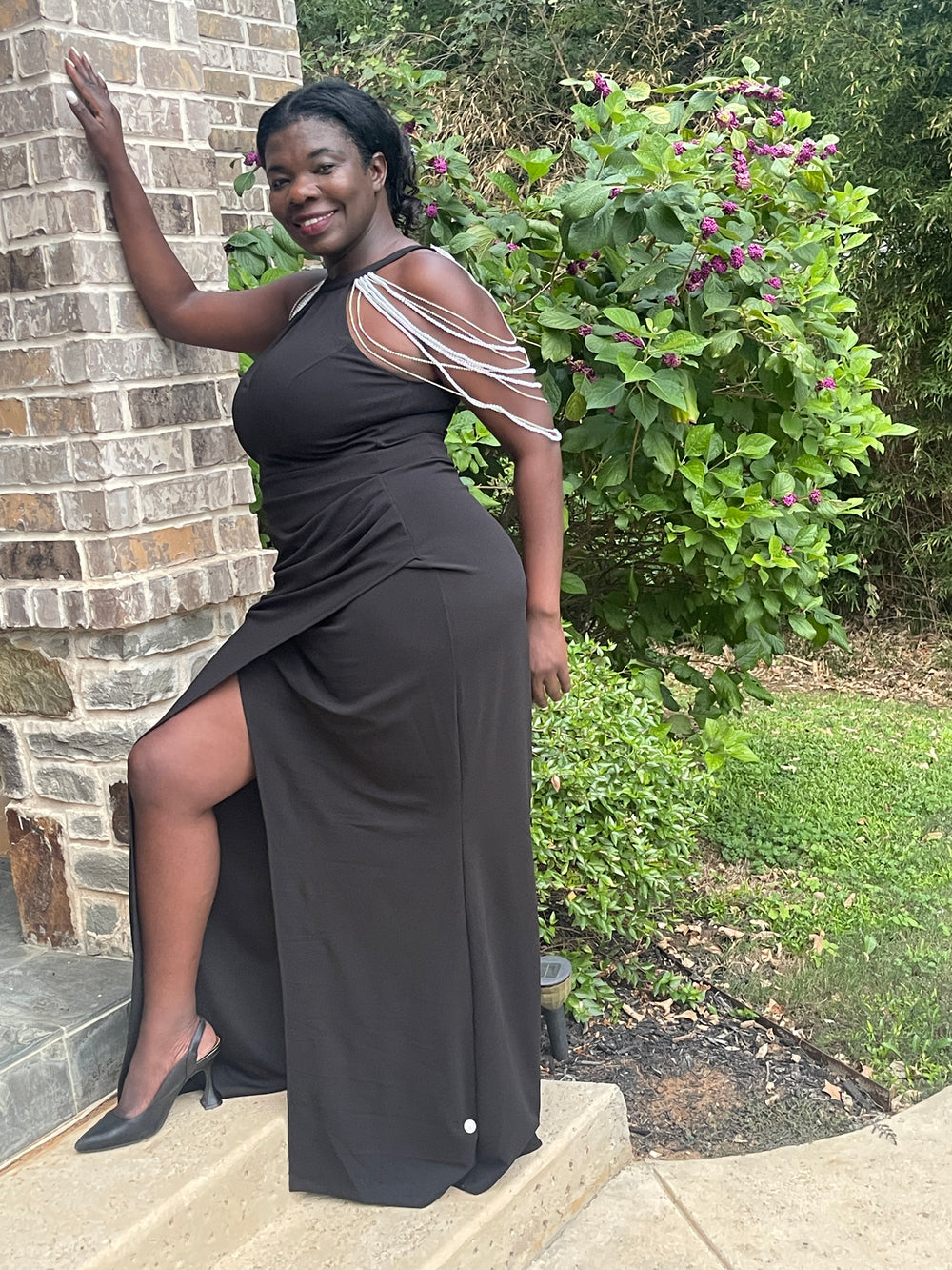 This stunning maxi dress is the perfect addition to your wardrobe. The halter neck and keyhole front add a touch of elegance, while the layered rhinestone chain shoulder detail adds a touch of glamour. The pleated side and front opening give the dress a flowy and flattering silhouette, perfect for any body type. The open back with button closure and zipper skirt add a modern and chic touch to the overall design. This dress is perfect for any special occasion or a night out on the town. Available in plus sizes, this dress is sure to make you feel confident and beautiful.