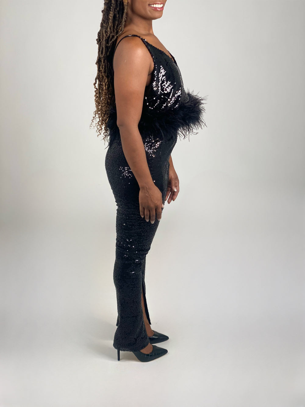 These Black Sequined Pants from Sassyn are the perfect addition to your wardrobe. Featuring an elastic waistband and front slits at the hem, these pants are sure to make a statement.