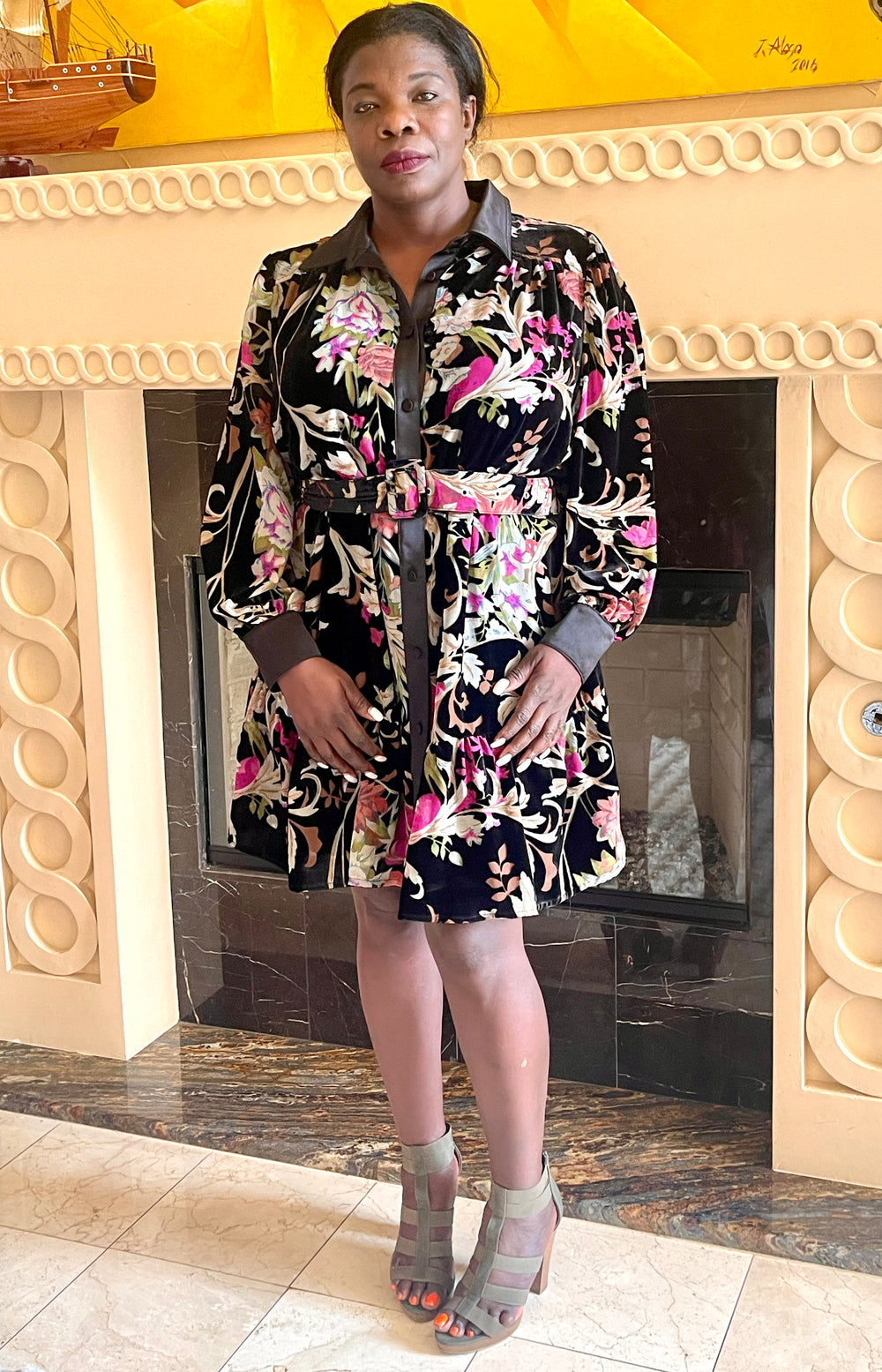 This Black Shirt Dress is a stylish and versatile piece. The dress features a collared neckline, a belted waist, and long sleeves. The fabric is a luxurious velvet with a floral pattern. The dress is a mini length, making it perfect for any occasion.