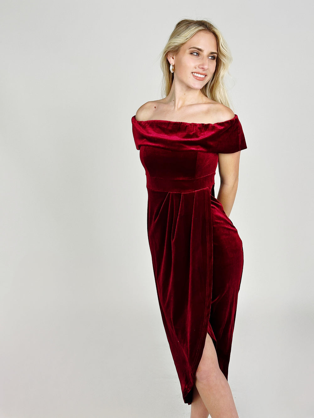 This dress is perfect for any special occasion. The burgundy color is timeless and will never go out of style. The off-shoulder design and front gather create a beautiful shape that will flatter any figure. The midi length and front slit add a touch of sophistication.