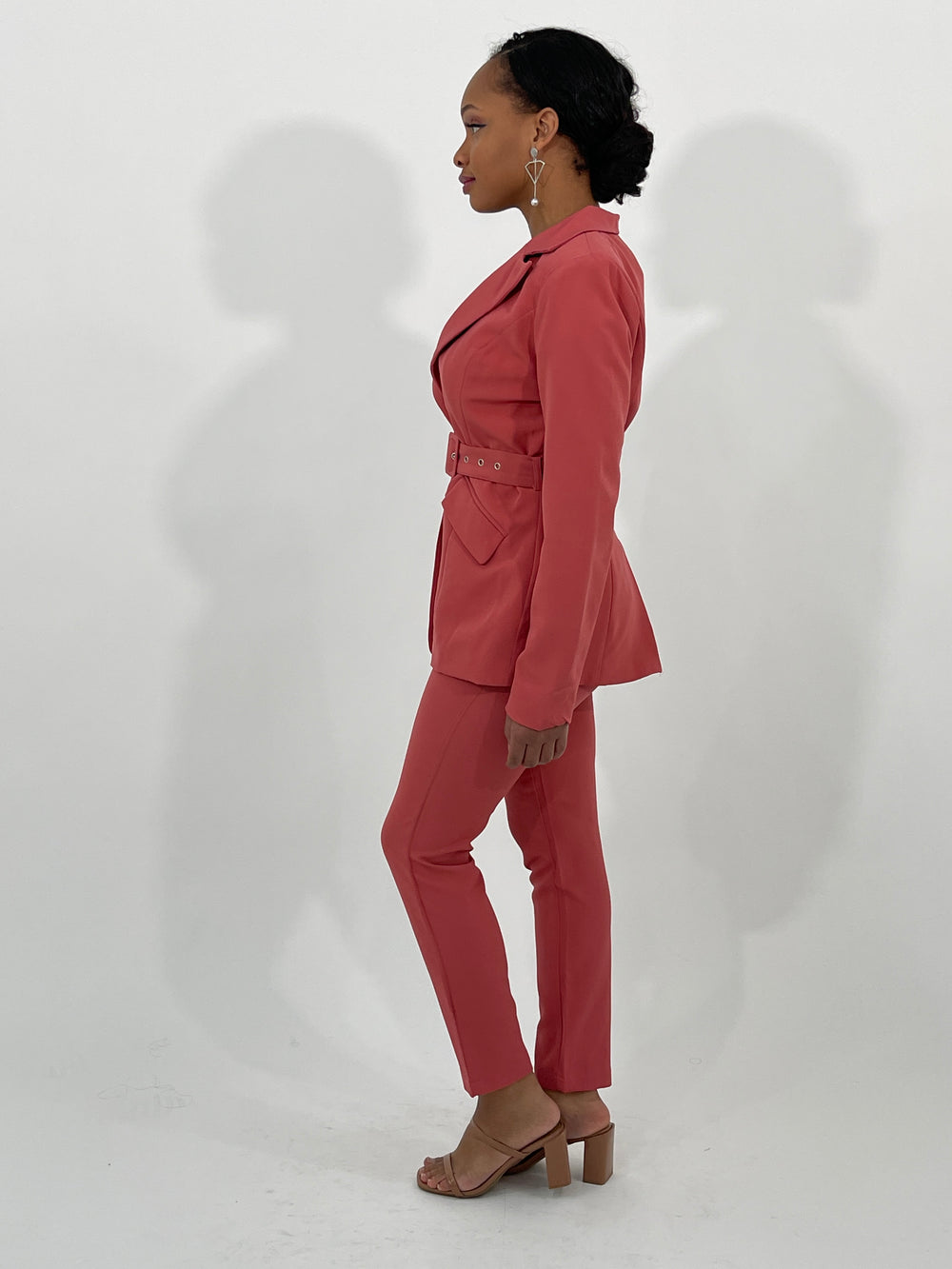 This Cinnamon Blazer & Pant Set from Sassyn is the perfect addition to your wardrobe. The blazer is buttonless and comes with a belt for a tailored look. The long sleeve slim pants complete the look.