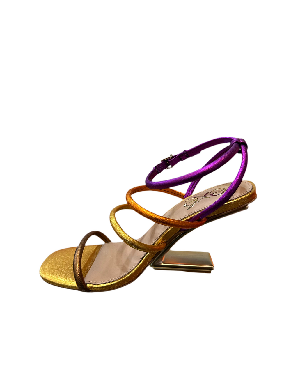 Crafted with the finest materials, these sandals feature a stunning gold and purple color scheme that will add a touch of glamour to any outfit. The soft and cushioned sole ensures all-day comfort, while the adjustable ankle strap provides a secure fit.