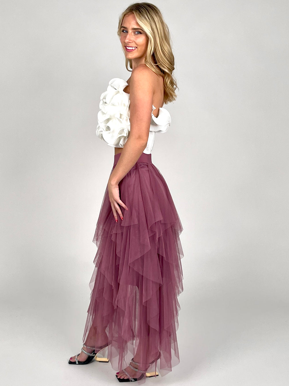 This Mauve Mesh Maxi Skirt is a beautiful and unique piece. It features a pull on elastic waistband, asymmetrical hem, and tiered ruffles. The lining adds a touch of elegance and the mesh fabric is lightweight and comfortable.