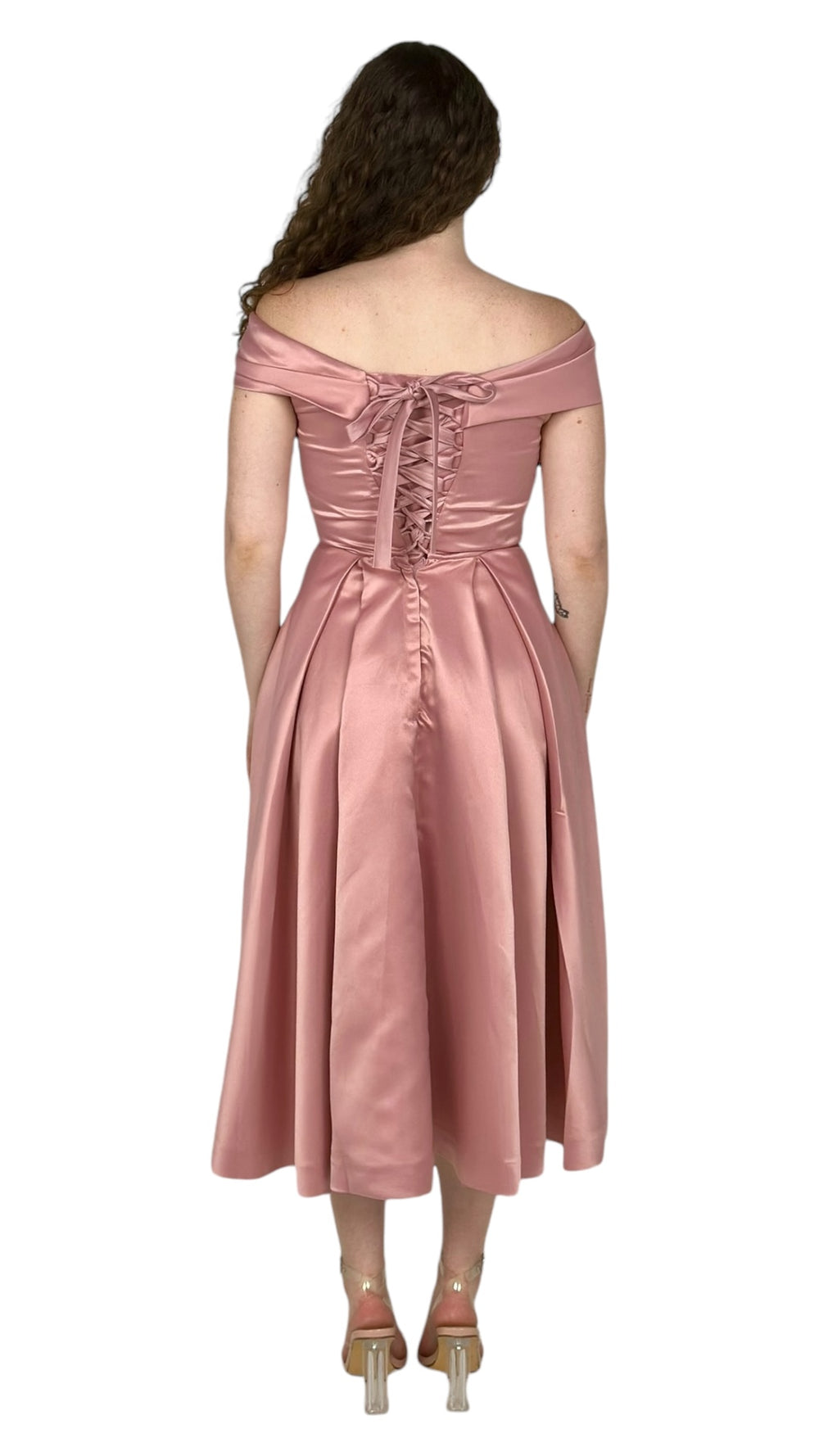 Mid-length satin ceremony dress in boat neck style with bow detail. Lacing closure and zip closure. It has pockets on each side