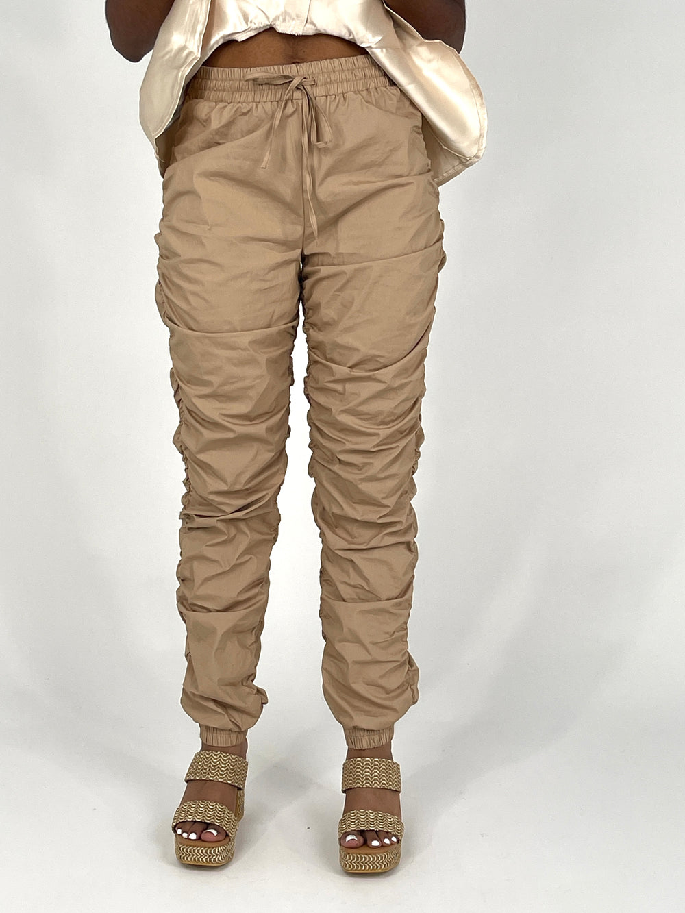 Introducing the Taupe Parachute Pants from Sassyn Shop. These stylish pants feature a high-waisted design with ruched detailing and an elasticated waist for a comfortable fit. The draw string cinching and elasticated cuffs complete the look.